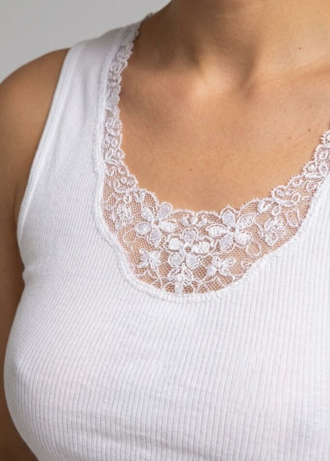 En 100% coton mercerisé, ce top sans manche est agrémenté d’une belle dentelle à l’encolure.